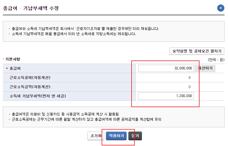 총 급여와 기납부세액은 회사가 근로자 기초자료를 등록한 경우에 보이며 등록하지 않은 경우는 직접입력 해야 합니다.