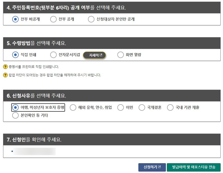 우리는 자녀를 기준으로 발급할 것이니 맨 위의 성명에는 자녀의 성명, 주민등록번호를 넣고, 추가정보확인에는 부모님 본인의 성명을 넣으면 됩니다.
