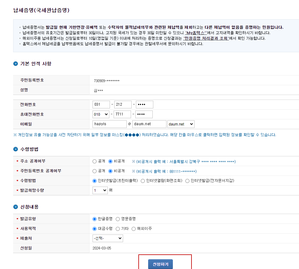 인증을 마친 후에는 기본 인적 사항과 수령방법, 주소나 주민등록번호 공개여부 등을 선택하고 신청내용에서 발급유형과 사용목적 등을 선택한 후 신청하기를 누르면 됩니다.