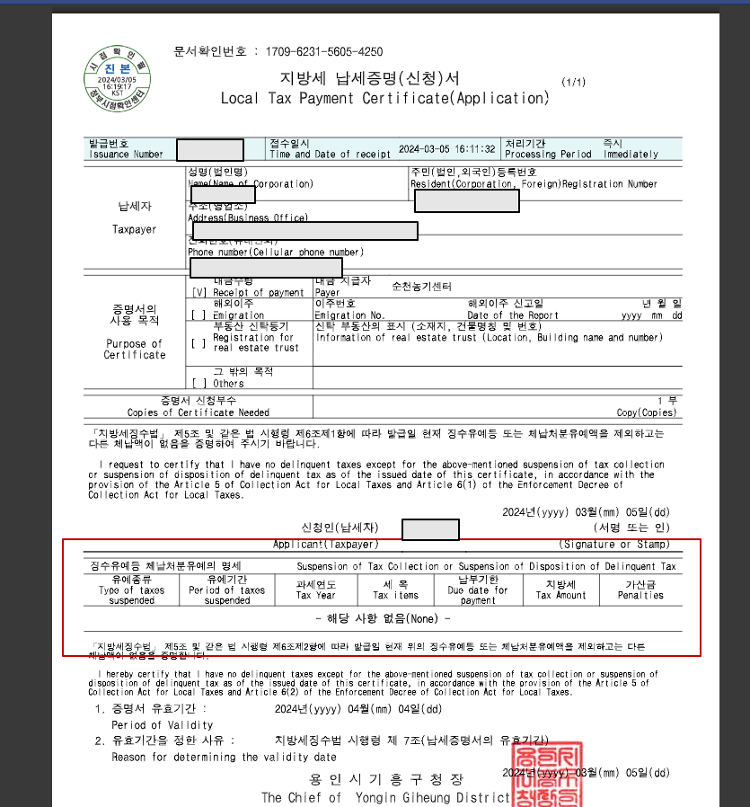 납세증명서에는 납세자 인적사항과 유효기간, 사용목적 등이 나와있습니다. 체크해 둔 부분에 해당 없음이라고 나오면 체납사실이 없는 것입니다.