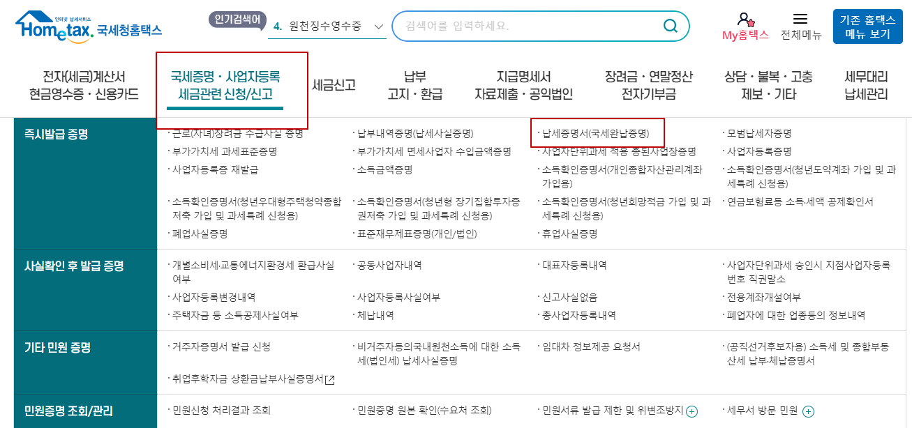 국세 완납증명서는 국세청홈택스 홈페이지에 들어가서 발급받을 수 있습니다. 상단의 메뉴에서 국세증명·사업자등록 세금 관련 신청/신고 메뉴에서 납세증명서(국세완납증명)를 클릭하여 들어가면 됩니다. 해당 과정을 진행하기 위해서는 계정이 있다면 로그인을 하시면 되고 그 외에 인증서, 간편 인증 등의 과정을 거쳐서도 진행할 수 있습니다.
